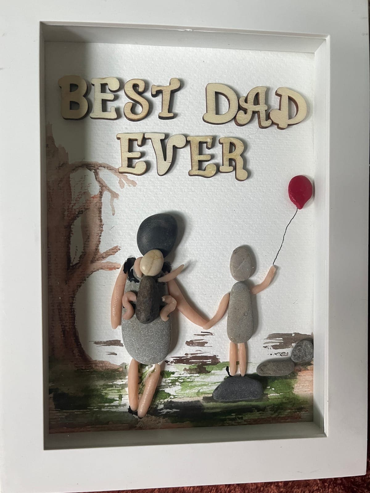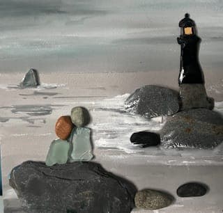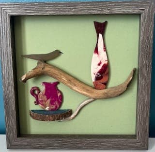 Unique handcrafted art work with pebbles, sea glass, resin, clay & fabric.